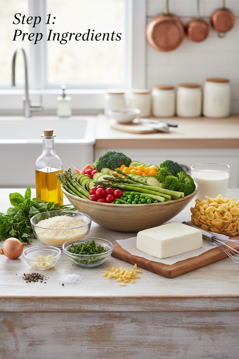 – Pasta: 12 oz (340 g) fettuccine, linguine, or penne – Vegetables (fresh and colorful): 1 cup snapped broccoli florets, 1 cup sliced bell peppers (mixed colors), 1 cup zucchini or yellow squash, 1 cup asparagus cut into bite-sized pieces, 1 cup cherry tomatoes halved, 1/2 cup peas or snap peas – Aromatics: 3 garlic cloves, minced – Creaminess: 1 cup heavy cream (or half-and-half for a lighter version) – Dairy: 1/2 cup grated parmesan cheese, 2 tablespoons cream cheese (optional, for extra body) – Finishing: Zest of 1 lemon, juice of 1/2 lemon (optional, for brightness), fresh parsley or basil, extra grated parmesan – Seasonings: Salt and black pepper to taste